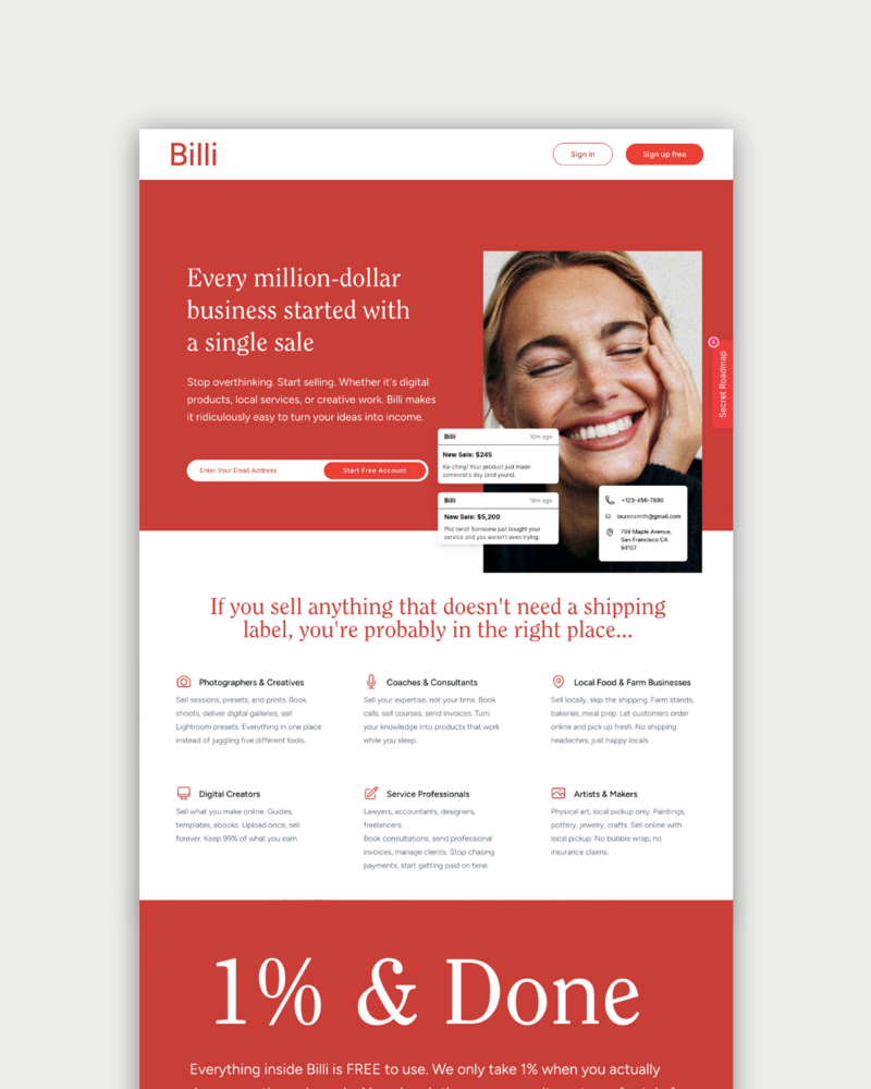Billi is a simple, powerful CRM + e-commerce hybrid built for service-based business owners. Sell online, manage clients, book appointments, send invoices, and get contracts signed. All in one clean dashboard.