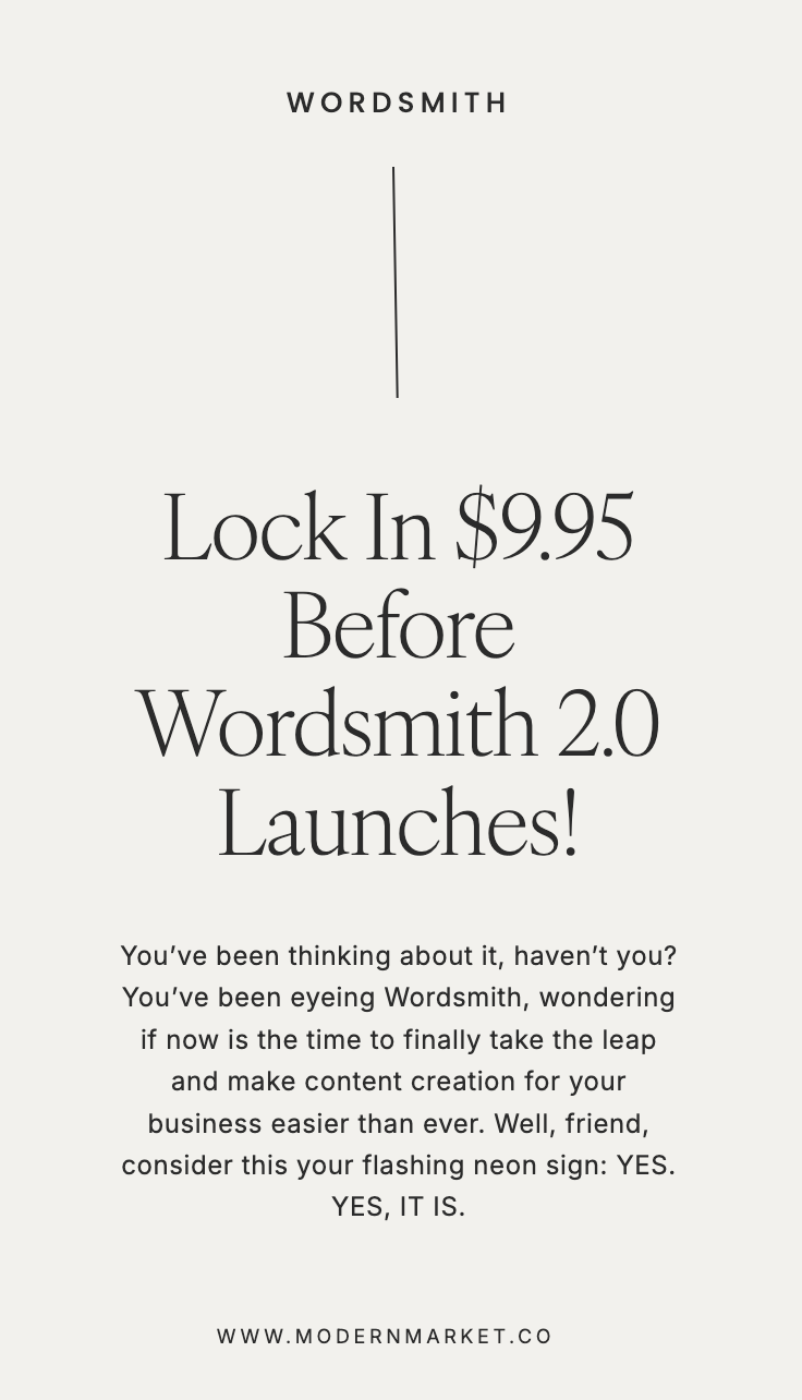That’s why I built Wordsmith. I wanted to create a tool that helps you show up authentically without spending hours staring at a blank screen. It should feel like having a personal copywriter in your back pocket—ready to whip up on-brand Instagram captions, blog posts, email newsletters, and website copy at the click of a button—so you can focus on what you do best: running your business and making an impact.